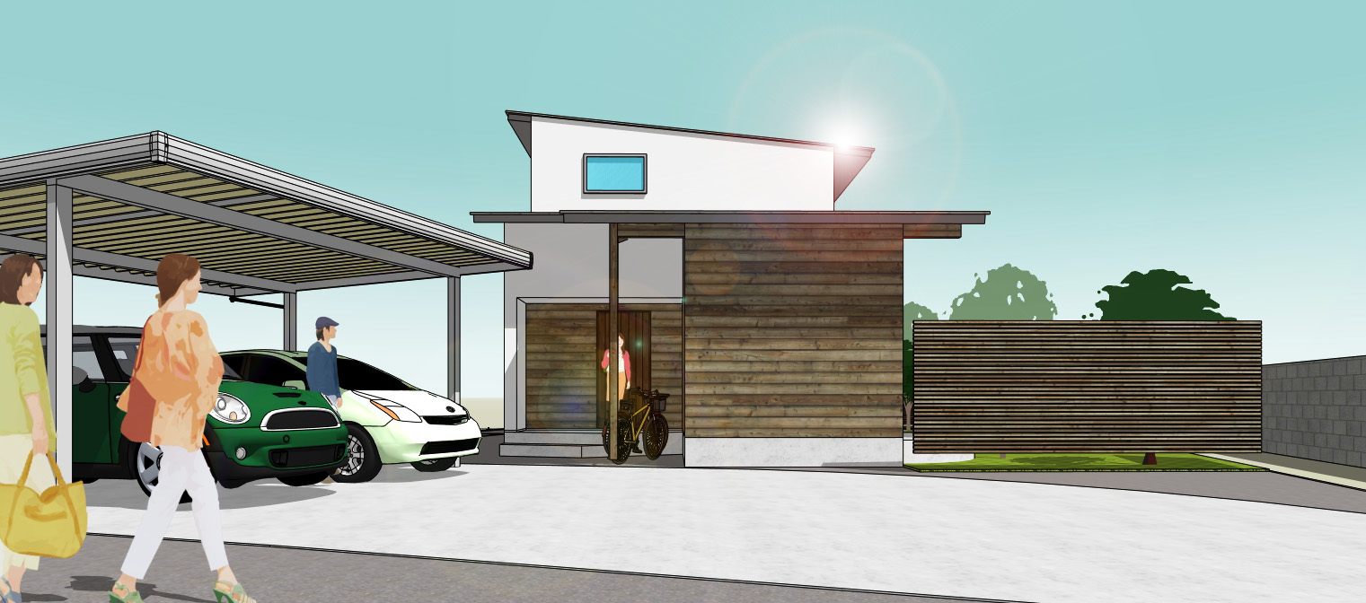 外壁:杉板張り、ガルバリウム鋼板角波張り